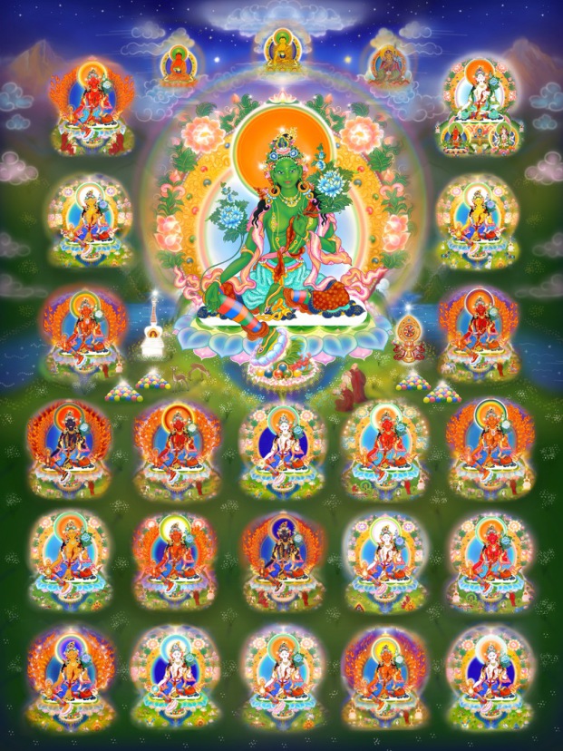 The images of the 21 Taras are based on the commentary of 'Praises to the 21 Taras', Khensur Rinpoche & Lama Lhundrup Rigsel Rinpoche.